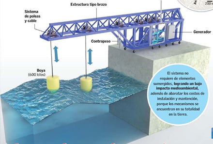 Los dos prototipos demostrativos y de baja capacidad de generación de energía están basados en un sistema mecánico que transmite la energía undimotriz absorbida por una o más boyas sometidas al movimiento de las olas hasta un sistema conversor de energía instalado en la orilla.