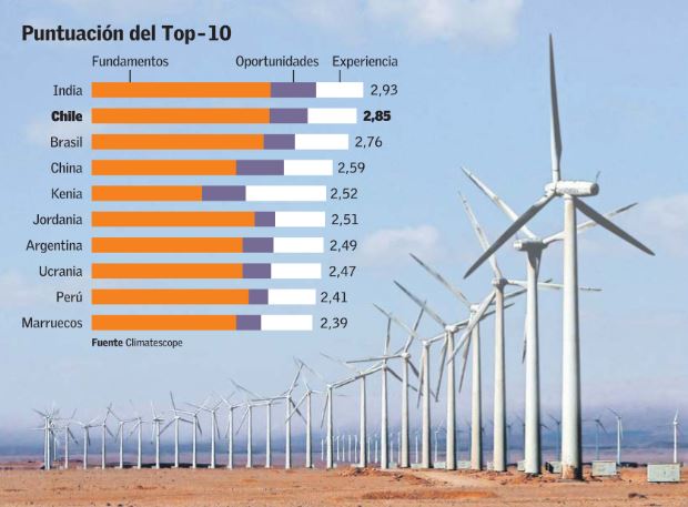 No repitió el primer lugar a nivel mundial, pero se mantiene en un lugar destacado: Chile es el segundo mejor país emergente para el desarrollo de proyectos de energías renovables, después de India. Así lo señala la última edición del ranking Climatescope elaborado por Bloomberg, que compara el atractivo entre las naciones en desarrollo para este tipo de iniciativas. Pese a que Chile cedió a la economía asiática la primera posición conseguida en la versión anterior, el país elevó su puntuación total hasta los 2,85 puntos, completando, además, el séptimo año consecutivo en el top 10.