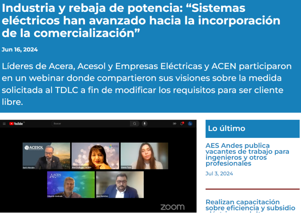 Esta materia se abordará en el próximo webinar que la Asociación Chilena de Comercializadores de Energía (ACEN) realizará este miércoles 5 de junio, donde se abordará el tema “¿Será beneficiosa la rebaja del límite de la potencia para el mercado eléctrico? La opinión de los gremios”.