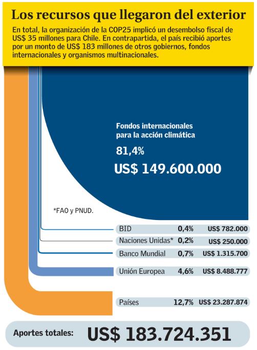 En el caso de Chile, presidir la COP25 significó un desembolso público en torno a US$ 35 millones. En contrapartida, el país logró captar significativos aportes e inversiones internacionales que, según la información oficial del Ministerio del Medio Ambiente, ascendieron a más de US$ 183 millones. De ellos, US$ 5 millones debían destinarse a ayudar a los países no desarrollados a asistir a la cumbre. Todo el resto irá a iniciativas que tienen directa relación con el cambio climático.