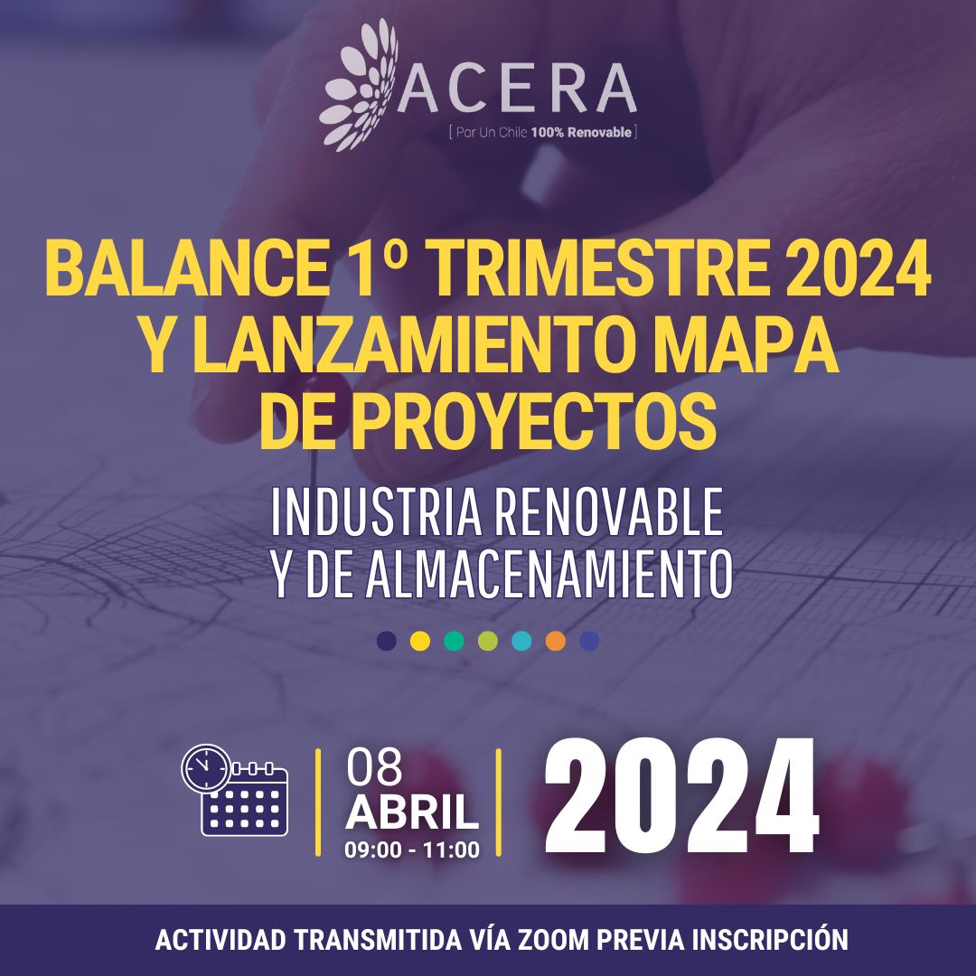 La Asociación Chilena de Energías Renovables y Almacenamiento, ACERA A.G., te invita a participar del balance de los principales hitos de la industria renovable y del almacenamiento durante el primer trimestre de 2024, así como el lanzamiento del Mapa Interactivo de Proyectos, una herramienta desarrollada por ACERA que concentra información detallada sobre los proyectos ERNC y sistemas de almacenamiento de nuestros más de 155 socios.