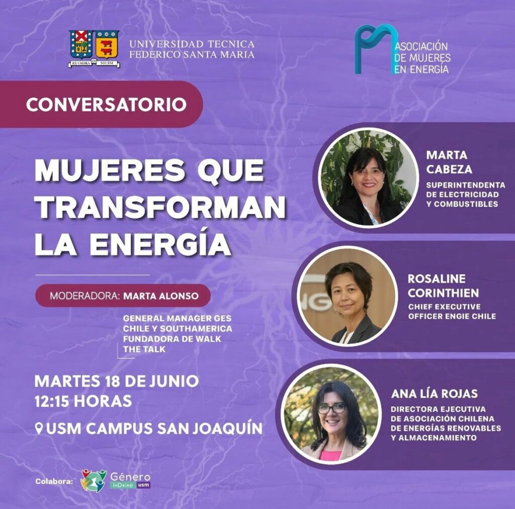 La Universidad Técnica Federico Santa María junto a la Asociación de Mujeres en Energía Chile organizaron un conversatorio junto a destacadas mujeres del sector, quienes compartirán su experiencia desde sus cargos y su experiencia en el sector.