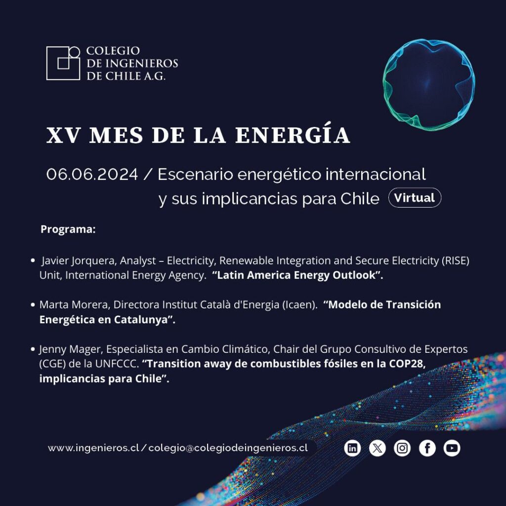 “Escenario Energético Internacional y sus Implicancias para Chile” es el título de la segunda jornada virtual de seminarios en el marco de la XV Versión del Mes de la Energía, organizado por la Comisión de Energía del Colegio de Ingenieros de Chile, y que reúne a un selecto grupo de especialistas nacionales e internacionales en materia energética.