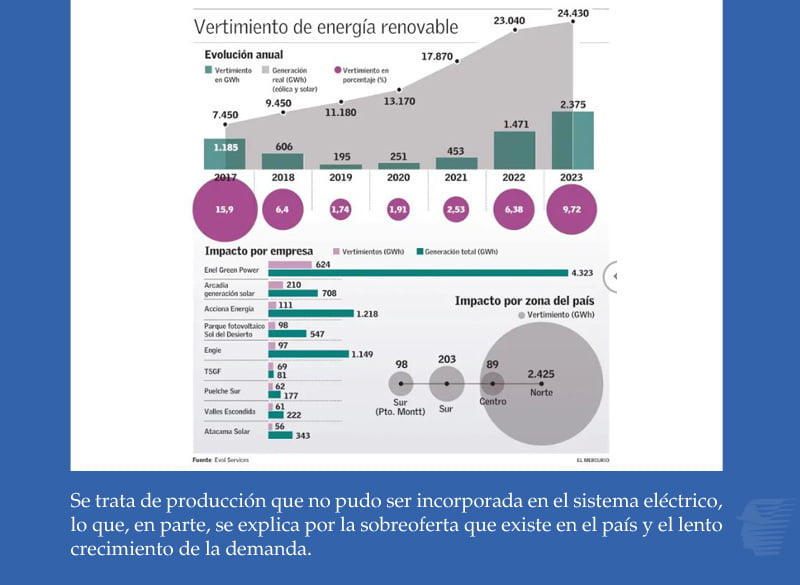 En particular, Enel Green Power Chile registró más energía vertida (624 GWh aproximadamente), pero la empresa con un mayor porcentaje de vertimiento respecto de su generación solar y eólica total fue TSGF, con un 46%.