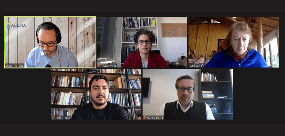 La presentación dio paso a un panel de conversación integrado por Sara Larraín, directora ejecutiva de Chile Sustentable; Carlos Barría, jefe de la división de Estudios y Política del ministerio de Energía; Javier Tapia, director ejecutivo de la Asociación de Transmisoras; Maisa Rojas, directora del CR2 de la Universidad de Chile.